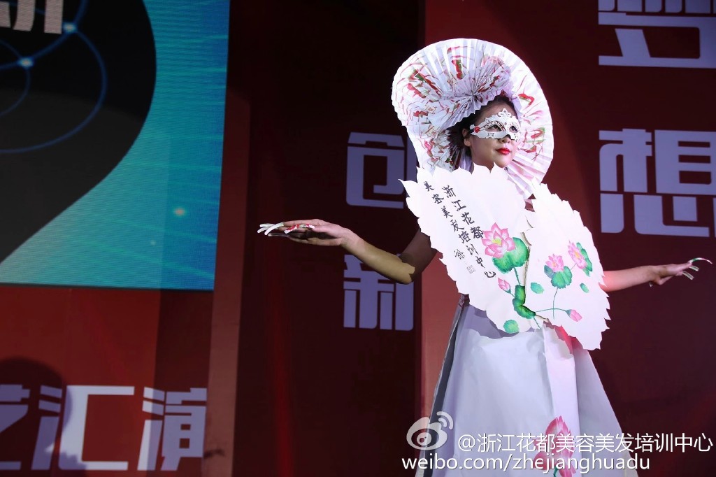 2015年6月28日下午,滨江区组织部主办,花都学校承办的“和合情青春梦”文艺汇演在滨江区海创园剧场圆满落幕。超过20个两新企业党组织参加了本次汇演,展示了滨江区两新企业员工的青春风采。花都学校提供了本次活动礼服,承担了所有节目的化妆造型任务,同时出演了精彩的时尚走秀,获得了最佳团队奖!滨江区委副书记俞少平、区委组织部长叶泽、副区长万爱民、政协副主席毛进、农工党滨江主委罗红英及花都学校党支部书记夏杰飞出席了本次活动。花都教师团队不仅仅要为上百名演员、主持人造型化妆,同时也精心准备了走秀作品!美甲班徐欠欠老师及学生团队作品:纯纸打造服装、头饰。