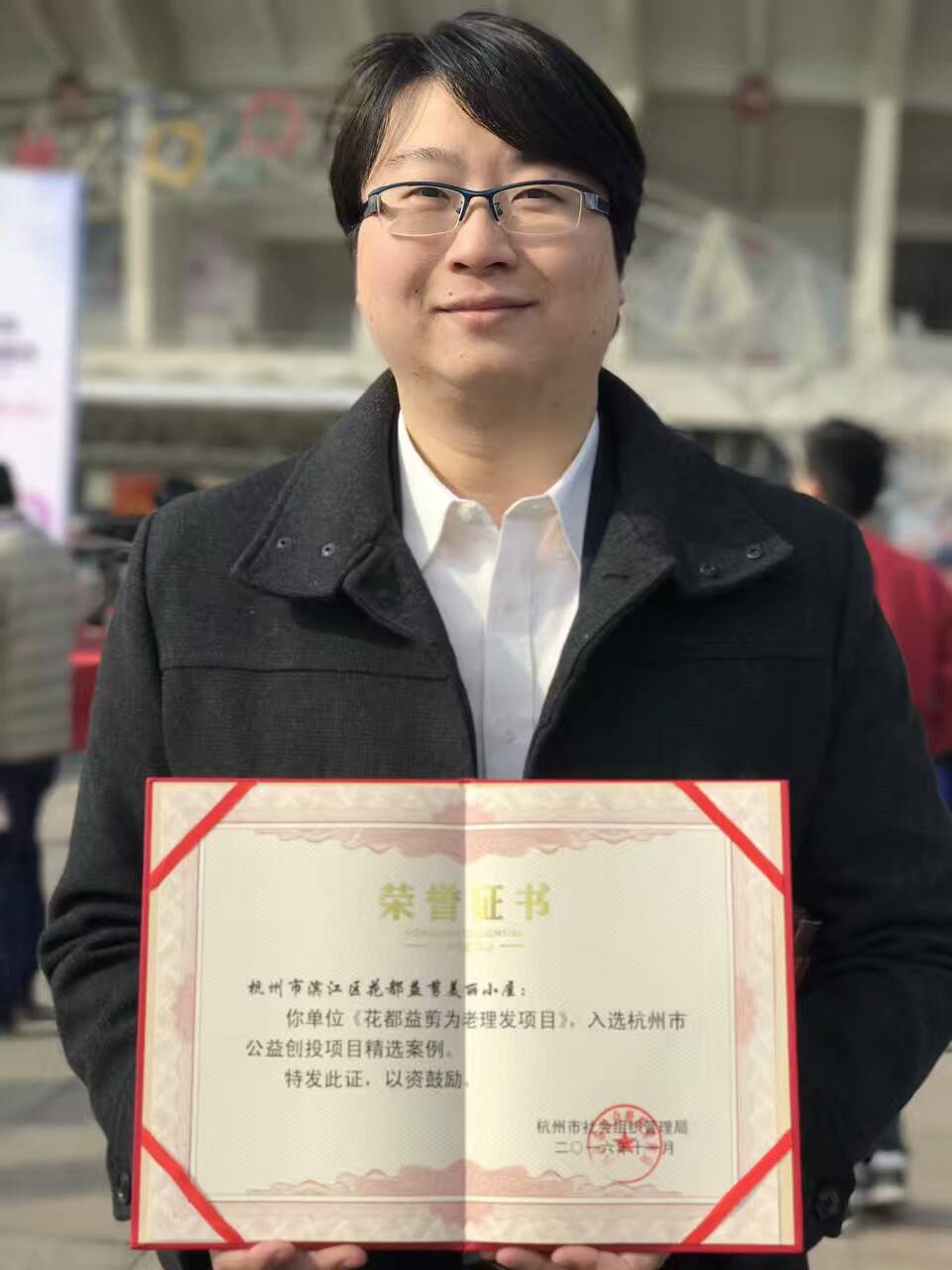 在2016年杭州公益嘉年华活动上,杭州市戚哮虎副市长、杭州市民政局徐小林局长为获奖单位颁奖。滨江区民政局鲍滨喜副局长、来四春科长为花都益剪负责人夏杰飞祝贺!花都益剪每年服务杭州老年人5万人次,项目获得社会各界一致好评!