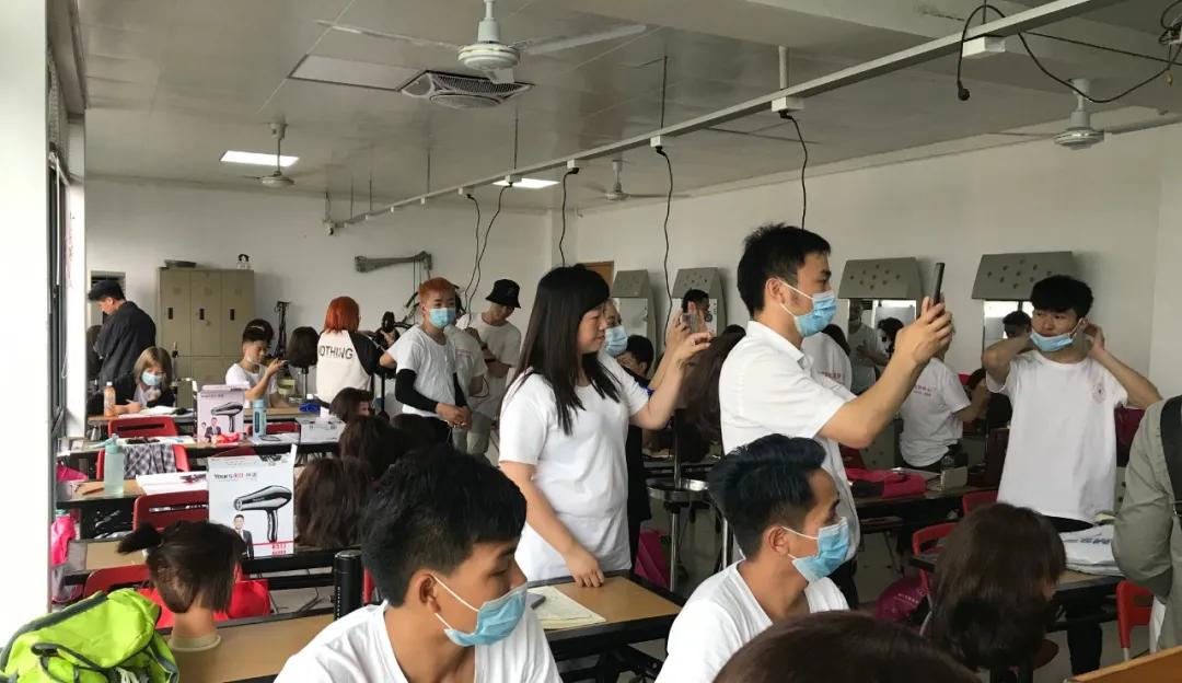 美容班学员正在教室里认真地上理论课,美发班学员正在对着一个个模拟发型开展实操练习。
