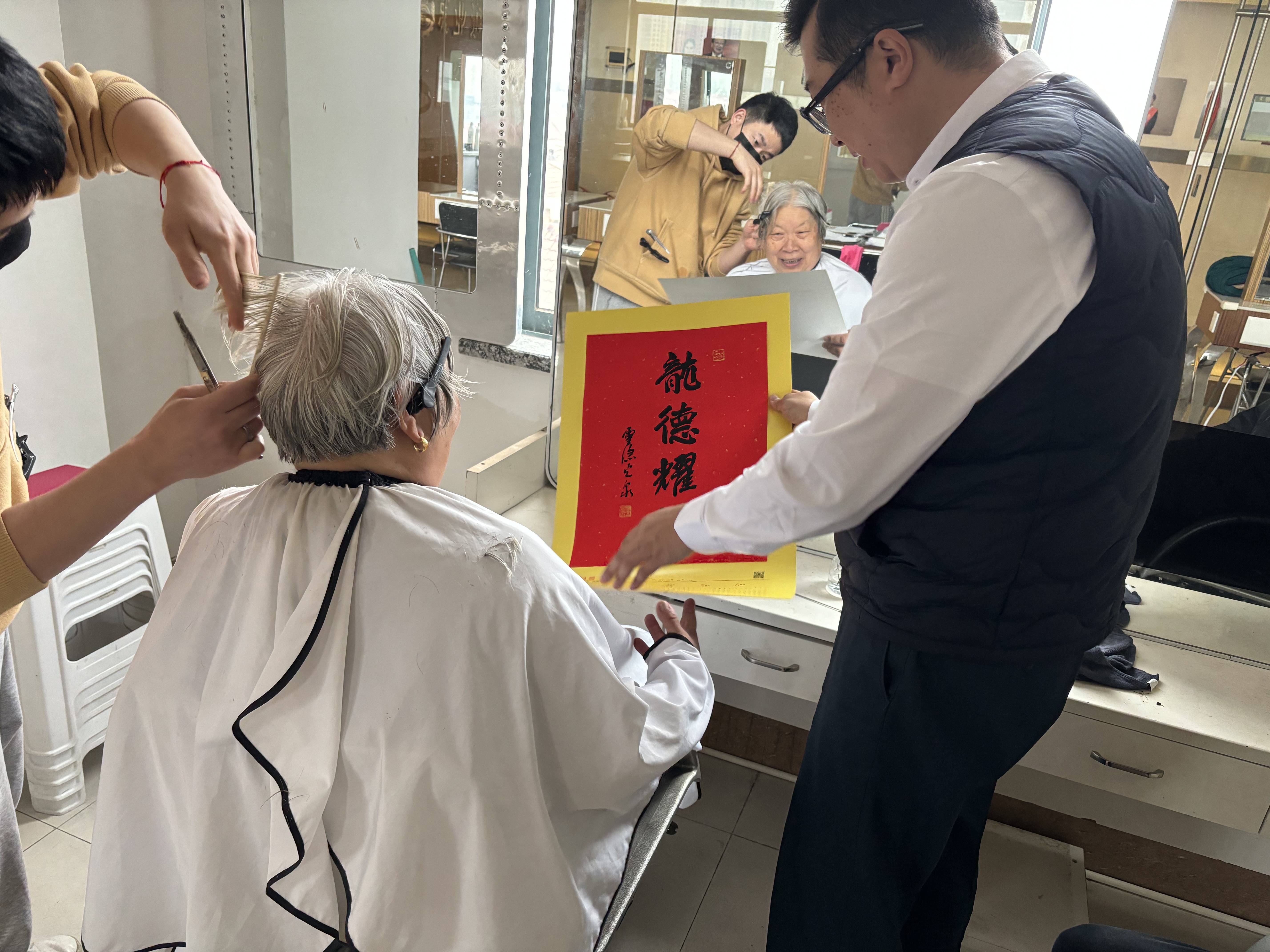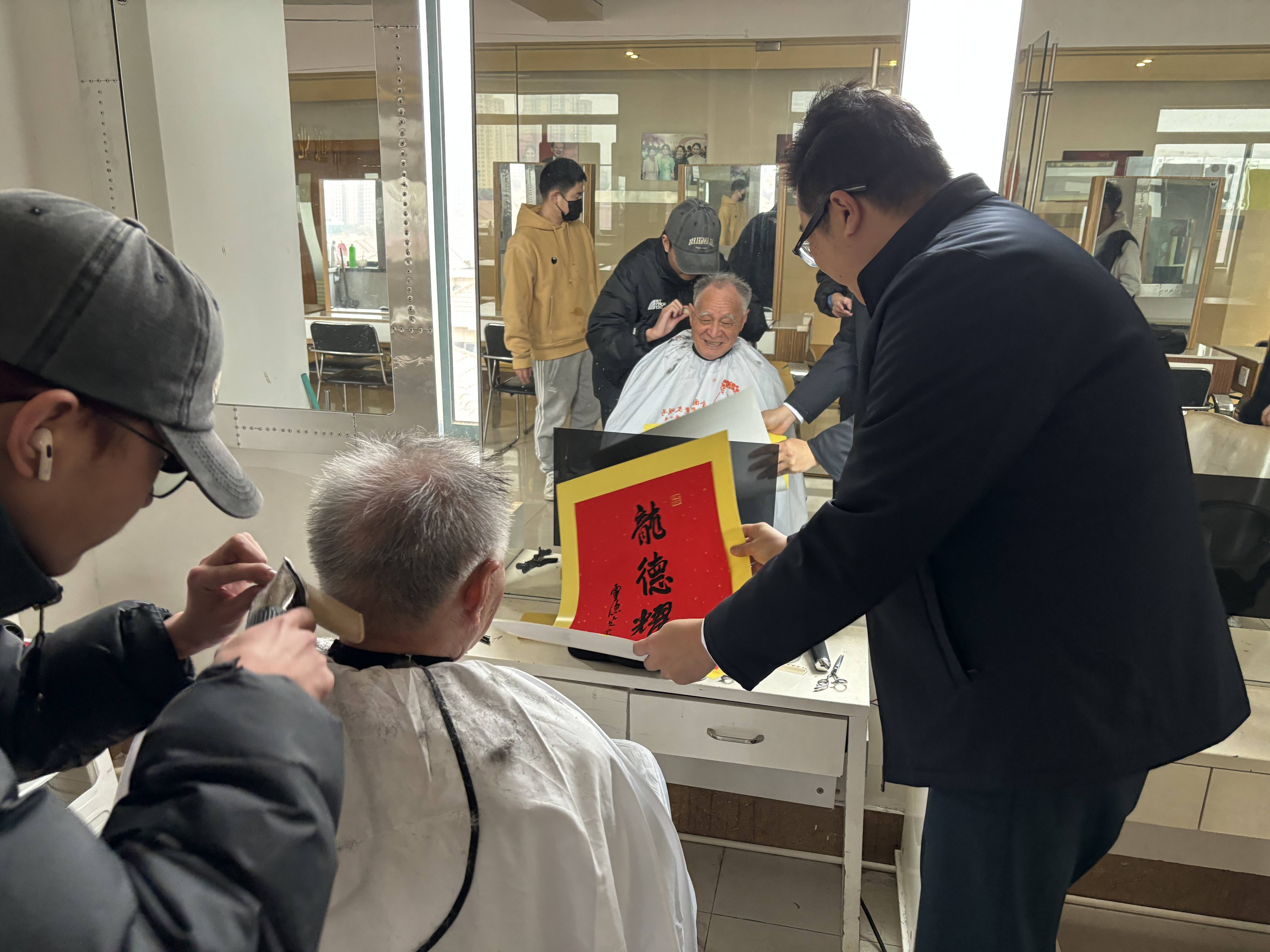 2024年1月,浙江花都美容美发培训中心党支部书记,为来花都益剪总部理发的老年人送上龙年祝福。